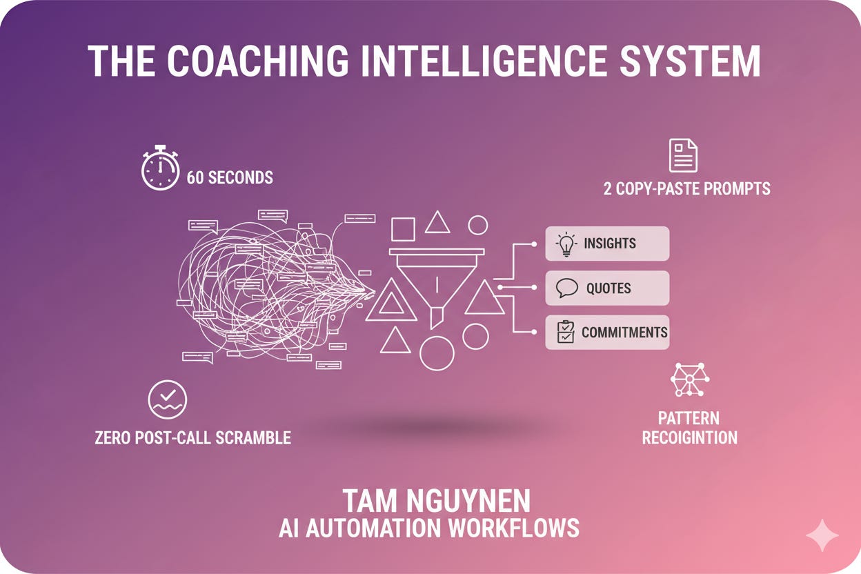 A coach told us: “It would be amazing to see patterns across all my clients - what creates breakthroughs, what language actually works.” That’s the dream, but here’s what you can do right now. Tam built the system that extracts intelligence while you’re still on the call.