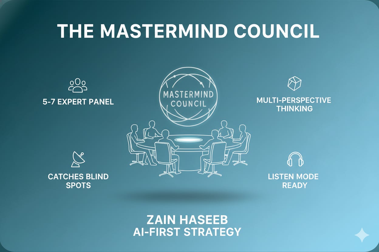 Most people use ChatGPT for one perspective. Zain’s Mastermind Council simulates how different world-class experts would approach your problem, debate each other’s assumptions, and converge on strategic recommendations you can actually use.